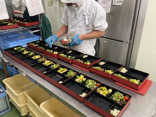 法人が運営する通所施設の昼食用弁当製造および、入所施設(ひたかみ園・グループホーム)の食事提供を行っております。